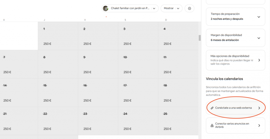 Ve a tu panel de propietario de Airbnb e inicia sesión. Haz clic en “Modo anfitrión/Gestiona los anuncios/Calendario/Selecciona el anuncio que quieres sincronizar/Disponibilidad”.
