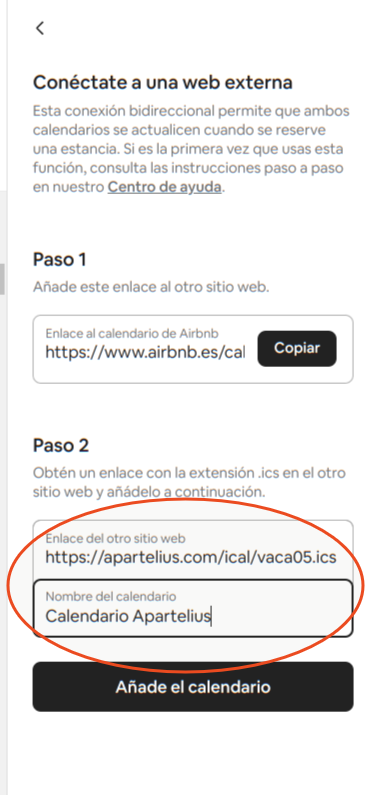 Ahora vas añadir el calendario ICAL de Apartelius en Airbnb. Copia el enlace de Apartelius, haciendo clic sobre el enlace que aparece en color naranja, y pégalo en el paso 2 de tu panel de propietario en Airbnb.